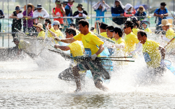 | ↑↑ 봉화읍 체육공원과 내성천 일원에서 개막한 제20회 봉화은어축제의 대표 프로그램인 제1회 문화체육관광부장관배 전국 반두잡이 어신선발대회 참가자들이 은어잡이를 하고 있다. |