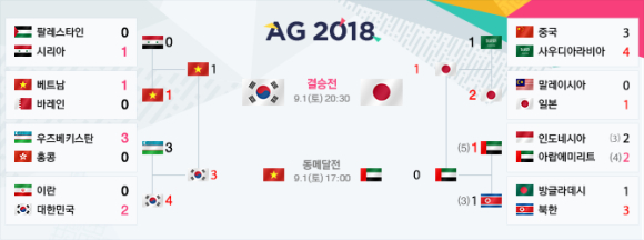 한국과 일본은 29일 열린 대회 준결승에서 각각 베트남(3-1 승)과 아랍에미리트(1-0 승)를 꺾고 결승에 진출했고, 우승 및 금메달의 행방은 우리나라 시간으로 9월 1일(토) 오후 8시 30분, 파칸 사리 스타디움에서 결정될 예정이다.