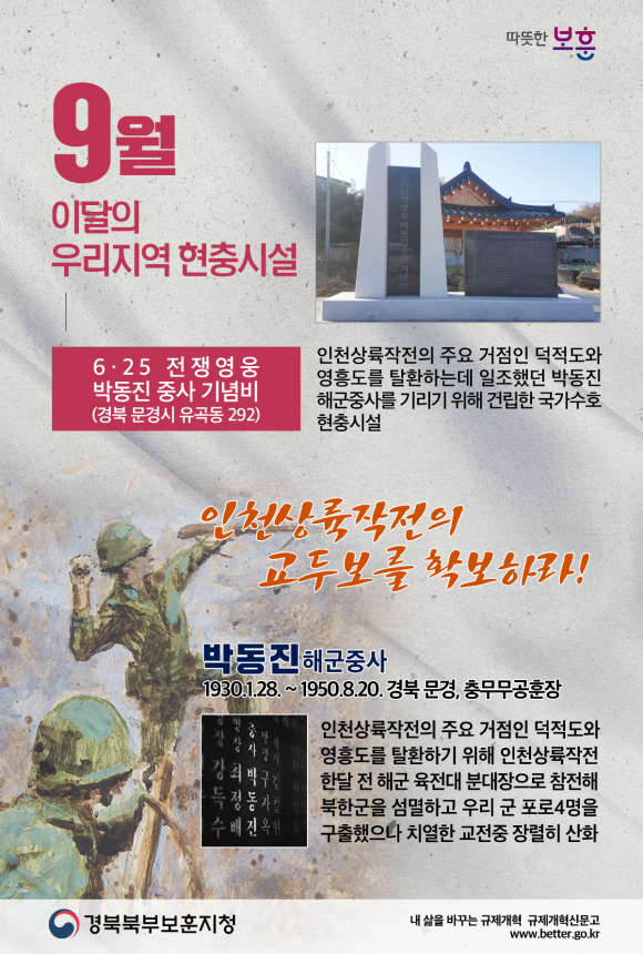 경북북부보훈지청(지청장 김상출)은 9월을 맞이하여 1950년 9월 15일에 펼쳐진 인천상륙작전을 상기하고자 ‘2018년 9월‘ 이달의 우리지역 현충시설로 6‧25 전쟁영웅 박동진 중사 기념비(경북 문경시 유곡동 292)를 선정했다.