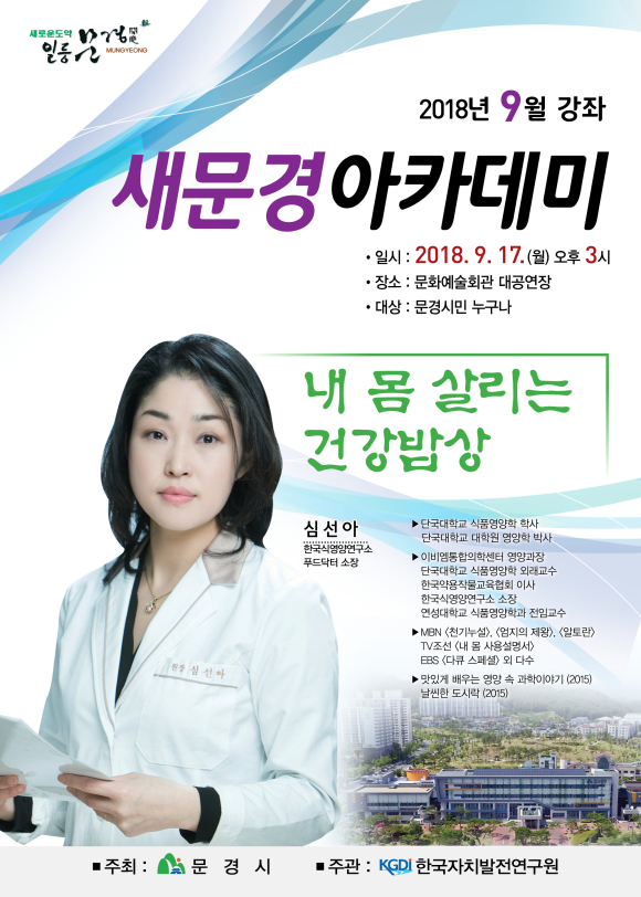 9월 17일 오후 2시 40분에 문화예술회관 대공연장에서 심선아 영양학 박사를 초빙하여 ‘내 몸 살리는 건강밥상’이라는 주제로 새문경아카데미 9월 특강을 개최한다.