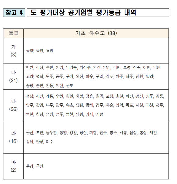 그 결과 행정안전부 주관 경영평가(153개 기관) 평점은 84.45점으로 전년 대비 0.65점, 도 주관으로 평가한 기초 하수도(88개) 평점은 83.31점으로 같은 기간 0.25점 각각 하락했다.