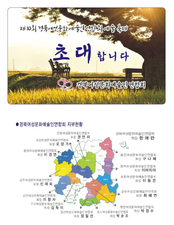 9일 연합회 관계자에 따르면 올해로 10회째를 맞이하는 이번 축제는 경북도내 여성문화예술인들이 가정생활을 영위하면서 다양한 분과에서 그 동안 갈고 닦은 아름다운 작품의 전시 및 수준 높은 멋진 공연을 선사할 예정이다.