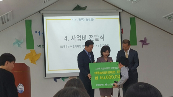 이어 초록우산어린이재단 김창연 본부장이 최종 선정된 신망애육원 기관에 이번 사업을 원활하게 수행할 수 있도록 2018년까지 아동놀이공간마련 사업비 5,000만원을 지원하는 전달식을 가졌다.
