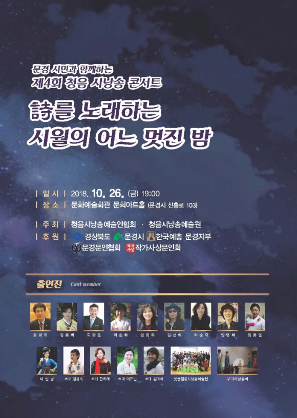 ‘시를 노래하는 시월의 어느 멋진 밤’이라는 주제로 펼쳐질 이날 공연에서 깊어가는 가을밤에 시가 전해주는 진함 감동을 관객들의 가슴을 함초롬 적셔 줄 명시를 10여명의 청음시낭송 회원들이 감미로운 목소리로 수준 높은 시낭송을 선사할 예정이다.