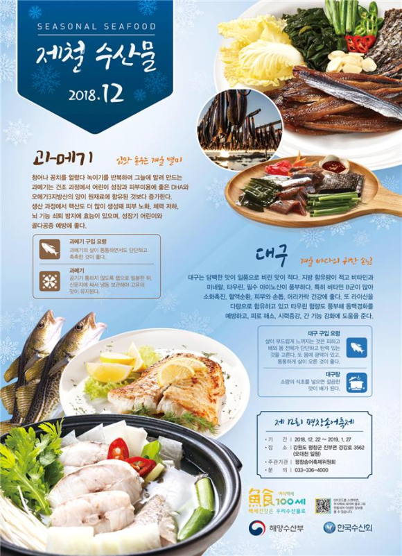 해양수산부(장관 김영춘)는 12월의 어식백세 수산물로 겨울철 영양식 ‘대구’와 ‘과메기’를 선정했다고 밝혔다.
