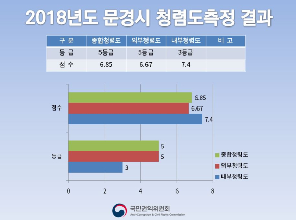 문경시는 이 평가에서 외부청렴도 5등급(6.67점), 내부청렴도 3등급(7.4점)을 받으면서 종합청렴도 5등급(6.85점)으로 강릉, 원주, 양주, 경주, 구미, 영천과 함께 75개의 시 단위 기초자치단체 가운데 최하위 등급에 이름을 올렸다.