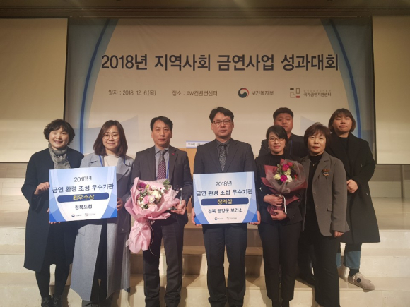 경상북도는 보건복지부에서 전국 시도 및 시군구 보건소를 대상으로 실시한 2018년 금연환경조성 분야 우수사례 평가에서 전국 최우수기관으로 선정돼, 6일 서울 AW컨벤션센터에서 열린 ‘금연사업 성과대회’에서 최우수상을 수상했다고 밝혔다.