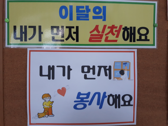 ‘내가 먼저 실천해요’ 운동은 매달 다른 실천 주제(인사, 칭찬, 사과, 사랑, 고마움, 청소, 봉사 등)로 학생들이 스스로 느끼며 실천할 수 있는 프로그램으로 매달 말에는 학급 자체 의논으로 우수 학생에게는 상품을 수여하며 생활지도 교육의 효과를 이끌었다는 평이다.