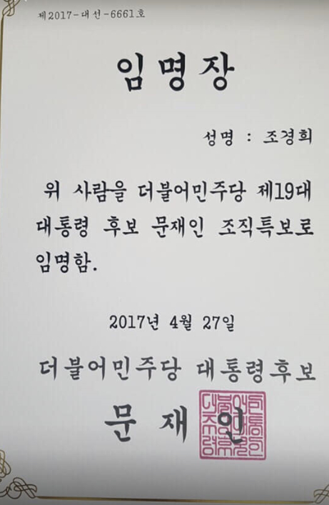 게다가 최교일 의원은 다니엘 조의 한국 이름은 ‘조경희’라고 주장했다. 최 의원은 "조씨는 2017년 4월 민주당 제19대 대통령후보 문재인 조직특보 임명장을 받았다"며 "또 같은 달 민주당의 제19대 대선 중앙선대위 중소벤처기업위원회 정책자문위원으로 임명장을 받기로 했다"고 밝혔다.