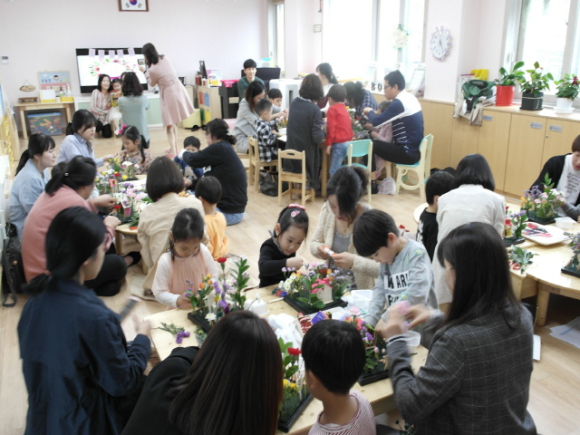 이어서 아이들이 기다리는 각반 교실로 이동하여 학부모 참여 수업은 생화를 이용한‘우리 집 정원 꾸미기’로 새하얀 도화지에 아이들의 꿈을 펼치듯 오아시스 땅 위에 우리 가족이 살고 싶은 정원을 아이와 부모님이 함께 꾸며 보는 즐거운 시간을 가졌다.