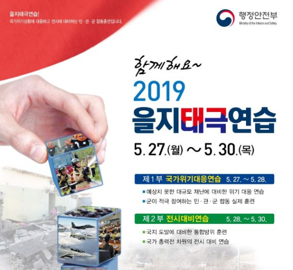 행정안전부(장관 진영)는 민·관·군이 참여하는 새로운 형태의 ‘2019 을지태극연습'이 오는 27일부터 30일까지 나흘간 실시한다.