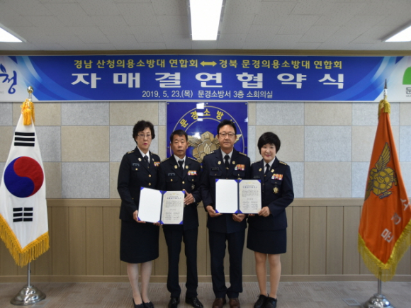 문경소방서(서장 오범식) 의용소방대연합회(연합회장 김태용)는 5월 23일 문경소방서 3층 소회의실에서 경남 산청소방서 의용소방대연합회와 의용소방대 상호간 화합증진과 정보교류를 위한 자매결연 협약을 체결했다.