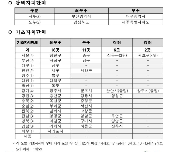광역자치단체, 부산·경북 최우수기관, 대구·제주 우수기관 선정 기초자치단체, 예천군 외 15개 시·군 최우수, 구미시 등 10개 시·군 우수, 영양군을 비롯한 7개 시·군 장려상 수상