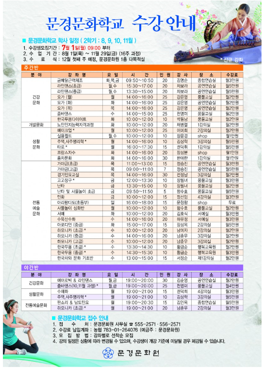모집대상은 문경시에 주민등록을 둔 만 19세 이상 시민은 누구나 신청이 가능하며, 교육기간은 8월 1일∼11월 29일 총 16주 과정이며, 개강식은 8월 1일 문화원 1층 다목적실에서 열린다.