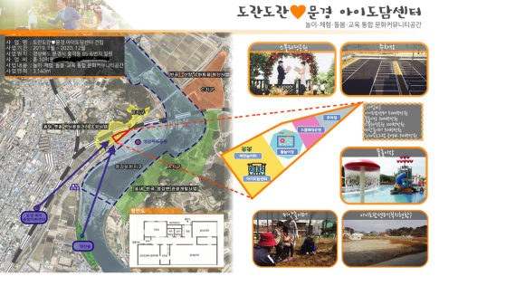‘도란도란-문경 아이도담센터 건립사업’은 총사업비 10억원을 투입해 문경시 흥덕동 일원에 맘커뮤니티룸, 놀이교육장, 실내놀이터, 그림책카페 등을 조성하여 부모와 자녀가 함께 할 수 있는 놀이․체험 교육 복합공간을 조성할 계획이다.