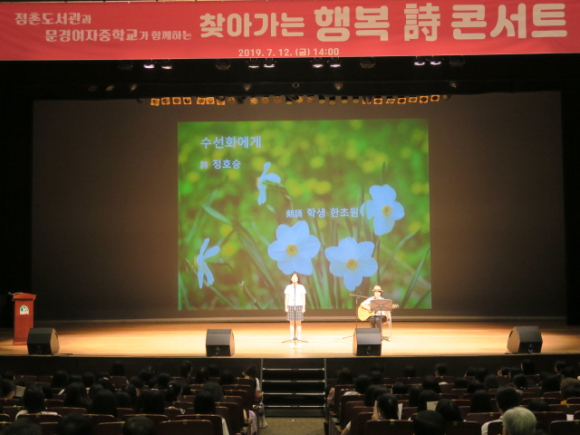 점촌도서관(관장 정석윤)은 7월 12일 문경문화예술회관 대공연장에서 문경여자중학교 학생, 교원, 학부모들과 찾아가는 ‘행복 詩 콘서트’를 개최했다.