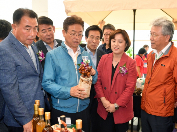| 사진: 이철우 도지사 시군 농산물 홍보 부스 라운딩 | 이번 경진대회에 ‘ICT의 농업분야 선도·창의적 활용 경진’에 참가한 김종연씨(예천, 유기농장 참한농원 대표)는 유기농 배와 배즙을 생산하는 전문농가로 SNS를 활용한 감성마케팅으로 충성고객을 확보하고 온라인 고객과 소통해 체험 및 일손돕기 프로그램을 활용해 인건비를 대폭 절감한 사례로 대상을 받았다.
