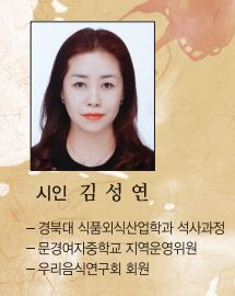 김성연 - 경북대 식품외식산업학과 석사과정 - 문경여자중학교 지역운영위원 - 우리음식연구회 회원