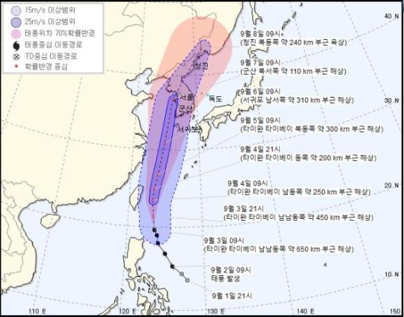 태풍은 오는 4일 타이완 동쪽을 통과한 뒤 6일에는 제주 남서쪽 해상까지 진출할 것으로 보이며, 7일 오전 3시부터 한반도 해상 부근에 진입해 이후 진로가 유동적이지만 서울을 지나 이튿날인 8일 청진을 향해 북동진할 것으로 관측되고 있다.