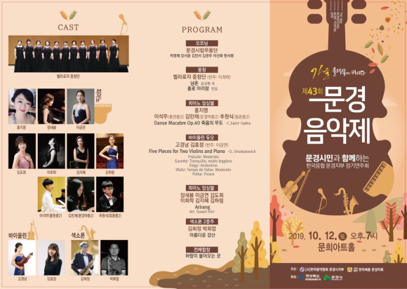 ‘제43회 문경 음악제’가 ‘가을 클래식에 빠지다’를 주제로 오는 10월 12일 오후 7시 문희아트홀 공연장에서 풍성한 문화공연을 펼친다.