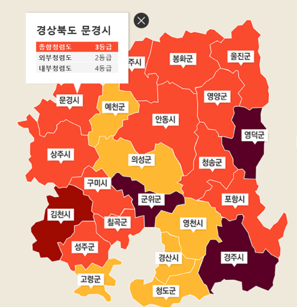 지난 12월 9일 국민권익위원회에서 발표한 자료에 의하면 2019년 공공기관 청렴도 측정 결과에서 문경시의 종합청렴도는 3급으로 지난해보다 상승한 것으로 나타났다.