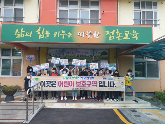 □ 아침 8시에 본교 정문과 신정문에서 20명의 학생과 선생님들은 학생들이 등·하교시 지켜야할 안전수칙 및 스쿨존에서 어른들의 안전운전을 홍보하는 피켓을 들고 캠페인을 실시하였다. 특히 2학기 개학을 맞이하여 등교하는 동생들에게 반갑게 인사하고 학용품을 선물로 나눠주었다.