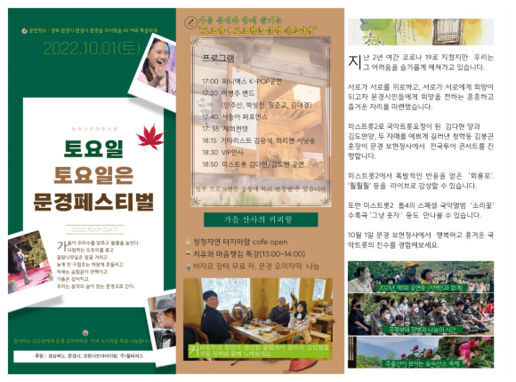 이번 행사는 코로나19 상황의 장기화로 지친 문경새재 관광객과 시민들을 위로하고, 음악을 통한 상생과 화합을 꾀하는 무대가 될 것으로 기대된다.