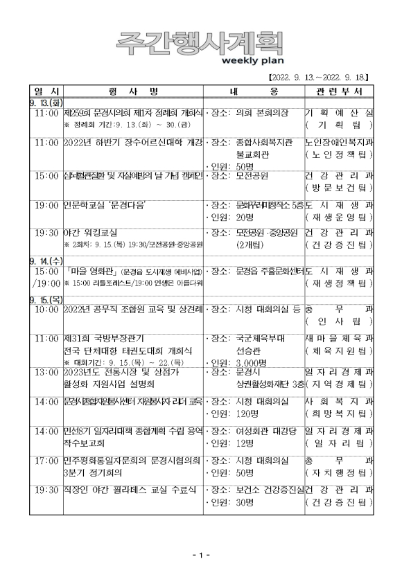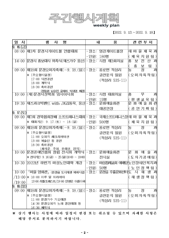 문경시 주간행사 안내(2022.09.13 ~18)