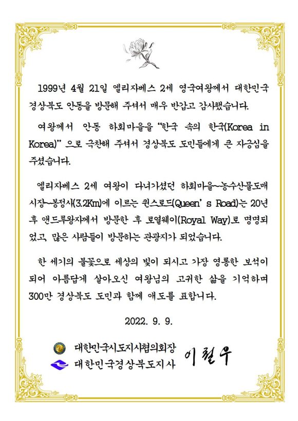 끝으로“한 세기의 불꽃으로 세상의 빛이 되고 가장 영롱한 보석이 돼 아름답게 살아온 여왕의 고귀한 삶을 기억하며 300만 경상북도 도민과 함께 애도를 표한다”라며 조의를 표했다. |