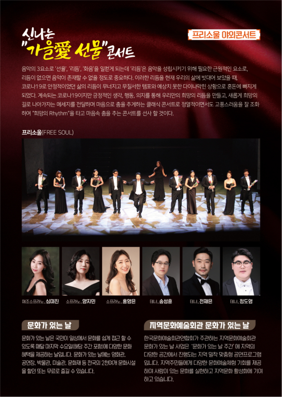 짙어가는 가을 밤 음악감상의 즐거움을 선사할 프리소울의 「가을 愛 선물콘서트」는 보다 쉬운 클래식 콘서트로 공연문화의 갈증을 해소하고 전 연령층이 함께 소통하는 콘서트이다. 총 4개의 파트로 구성되는 이번 콘서트는 “가을 愛 클래식 오페라”, “가을 愛 로맨틱 뮤지컬”, “가을 愛 애니메이션”, “가을 愛 소통하는 음악” 순으로 진행될 예정이다.