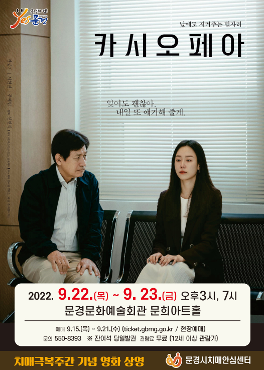 문경시 치매안심센터는 치매극복의 날(9월 21일)을 맞아 9월 22일(목)부터 9월 23일(금)까지 오후 3시와 오후 7시(총4회) 시민을 대상으로 문경문화예술회관 문희아트홀에서「카시오페아」영화를 무료로 상영한다.