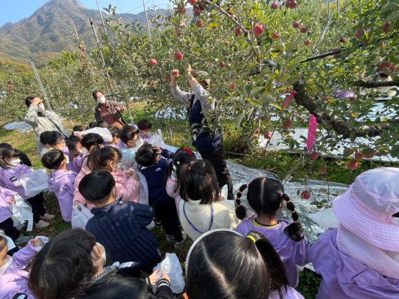 문경유치원(원장 최현해)은 10월 27일(목) 가을의 정취를 느끼며 ‘문경새재농원’에서 사과 따기 및 문경새재 걷기 체험 학습을 실시하였다. 사과는 문경을 대표하는 특산물 중 하나로, 이번 사과 따기 체험학습은 유아들이 평소에 자주 먹는 사과를 직접 따보는 경험을 통해 수확의 기쁨을 느끼고 계절의 변화에 따른 제철 과일의 맛을 즐기는 것을 목적으로 하였다.