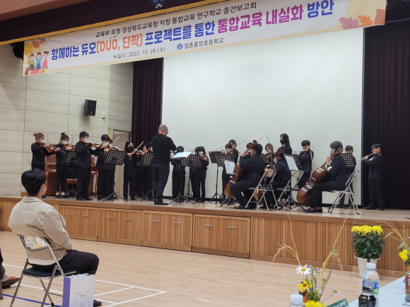 특히 통합교육 연구학교(정다운학교)의 성과를 보고하는 운영보고회에서는 학교의 자랑, 단짝 오케스트라가 ‘아리랑’ 외 1곡을 멋지게 연주해 참석한 선생님들의 눈길을 끌었다. 또한 이후 진행된 운영 보고에서는 점촌중앙초등학교가 통합교육에 얼마나 진심인지 보여주었다. 본교 연구학교 수업 컨설턴트인 구미오태초 김상국 교감선생님께서는 “협력 수업을 할 때 가장 중요한 건 특수교사와 통합학급 교사의 호흡이라고 생각한다. 교육 현장에서 많이 볼 수 있는 모습이 아닌데 점촌중앙초가 멋진 예시를 보여줘서 앞으로의 모습이 더 기대된다.”라고 평가를 남겼고 연구학교 운영에 관한 지도·조언을 위해 참석한 문경교육지원청 김현오 교육장께서는 “아이들에게 실질적으로 의미 있는 활동을 잘 보여줘서 감사하다.”, “앞으로도 통합교육의 내실화에 더 힘쓰는 점촌중앙초가 되길 응원하겠다.”라고 말했다.