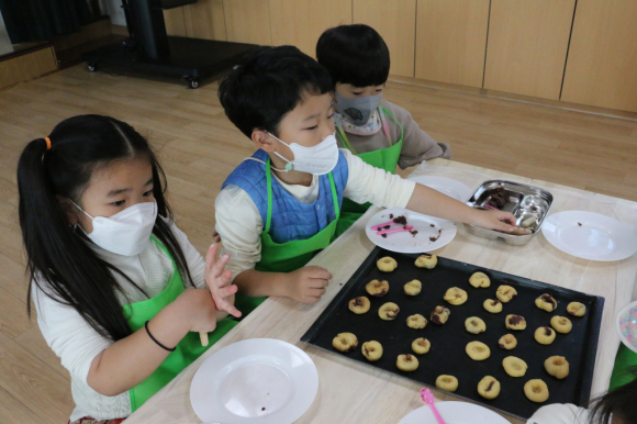 오미빵은 문경의 특산물 오미자를 이용하여 만든 빵으로, 밀가루 반죽에 단팥 고명을 넣고 오븐에 구워낸 빵에 오미자 잼을 올려 만든다. 아이들은 고사리같은 손으로 말랑말랑한 밀가루 반죽을 조물조물 만지며 납작하게 만든 후, 단팥을 넣고 반죽으로 감싸 동그랗게 굴렸다. 그 다음 도구를 활용하여 동그란 반죽 가운데 구멍을 내고 오븐에 구운 후, 빵 위에 빨간 오미자 잼을 짜서 장식하였다. 오미빵 만들기 체험에 참여한 유아들은 “밀가루 반죽이 클레이를 만지는 느낌이랑 똑같아요.”, “오미자 잼이 들어가서 새콤달콤한 맛이 날 것 같아요.”, “오미빵이랑 오미자 주스랑 같이 먹으면 더 맛있을 것 같아요!” 등의 소감을 전했다. 문경유치원은 앞으로도 유아들의 오감 및 심리·정서 발달을 돕기 위한 다양한 체험 활동을 실시할 예정이다. |