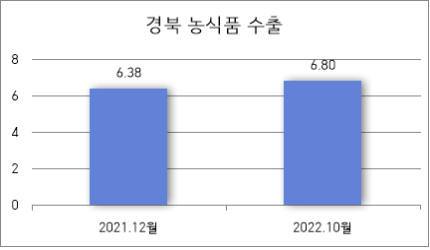 경상북도는 올해 10월 기준 경북 농식품 수출액이 6억7964만불로 지난해 같은 기간 4억8천545만불 대비 40.0%증가한 것으로 나타났다고 밝혔다. *통계근거 : 한국농수산식품유통공사