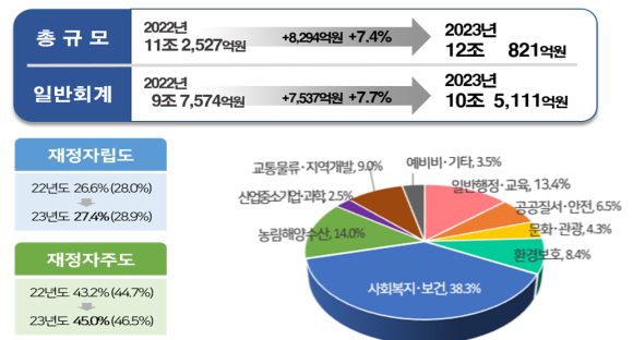 경상북도는 2023년도 당초예산안 규모를 12조 821억원으로 확정하고, 도의회에 제출하였다. ◦ 내년도 예산규모는 금년 당초예산 11조 2,527억원 보다 8,294억원(7.4%) 증가한 12조 821억원이다. - 일반회계 10조 5,111억원(전년대비 ↑7,537억원, ↑7.7%) - 특별회계 1조 5,710억원(전년대비 ↑757억원, ↑5.1%)