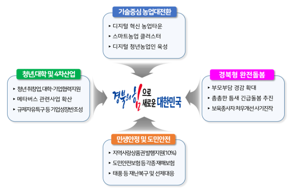□ 2023년도 예산편성 방향은 ◦ 민선8기 도정목표 실행을 위한 10+1 분야에 투자하면서 특히, “청년이 찾아오는 교육일자리・산업기반 마련”,“기술중심의 농업대전환”, “부모부담제로 완전돌봄체계마련” 및 “민생안정 및 도민안전” 4대 중점과제에 우선 순위를 두어 지금까지와는 다른 새로운 지방의 역할 모델을 제시하여 경북도가 한층 더 도약할 수 있는 계기를 마련할 계획이다.