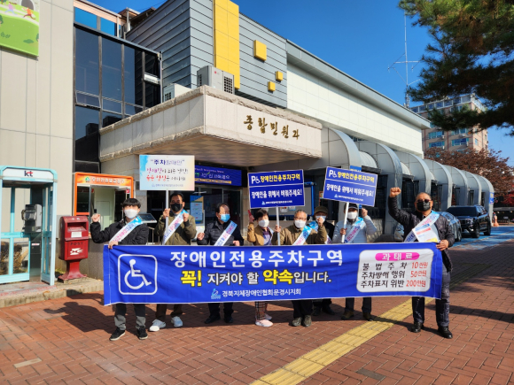 (사)경북지체장애인협회 문경시지회(지회장 박홍진)는 지난 11월 17일(목) 회원 및 임직원 10명과 함께 문경시청, 모전도서관, 점촌5동 행정복지센터를 이용하는 민원인을 대상으로 장애인전용주차구역에 대한 홍보 및 계도의 시간을 가졌다.