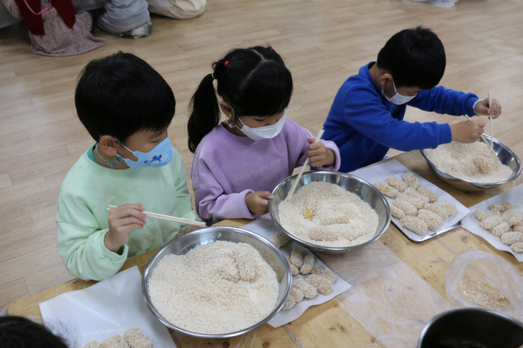 한과 만들기에 참여한 유아들은 “쌀 튀밥에 한과 숨겼는데 찾아보세요~!”, “한과가 너무 부드러워서 살살 녹아요.”, “가족이랑 나눠 먹고 싶어요”라고 이야기하며 소감을 밝혔다. 최현해 원장은 “한과 만들기 체험으로 쌀로 만든 음식에 대해 관심을 가지고 우리나라 전통 음식에 대한 이해를 높이는 시간이 되었기를 바란다.”고 말했다. |