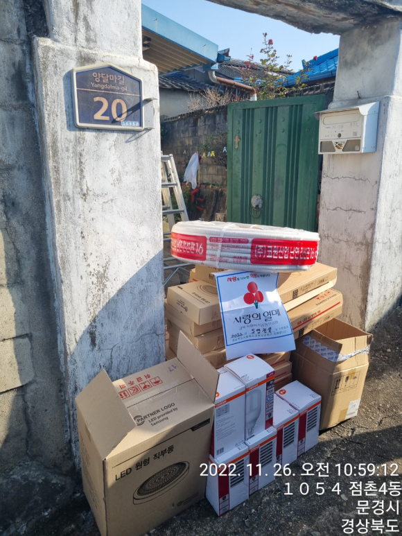 문경 Yes자원봉사단(단장 권태광)은 11월 26일(토) 점촌4동에서 , 신성호시의원, 김환국 11통장이 함께한 가운데 취약계층 2가정을 방문하여 전기누전으로 인한 화재 예방, 어르신들의 안전을 고려한 실내 및 외부 밝은 LED 등교체, 노후스위치 및 배전판교체 등 다양한 자원봉사활동을 펼쳤다.