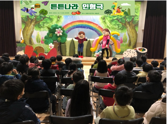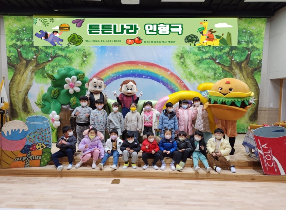 당포초등학교병설유치원(원장 성태기)은 2022년 12월 7일(수) 본원 유아 및 공동교육과정 운영 3개원(문경, 동성, 용흥) 유아 전체 58명을 대상으로 용흥초등학교 강당에서 열리는 튼튼나라 인형극 관람을 실시하였다.