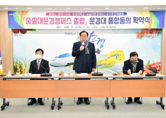 문경시는 11월 10일(토) 11시 30분 시청 제 2회의실에서 신현국시장, 황재용시의회의장, 문경대학교 신영국총장, 숭실대문경캠퍼시유치추진위원회 고정환위원장이 참석한 가운데 숭실대문경캠퍼스 설립 문경대 통합동의 확약식을 개최하였다.