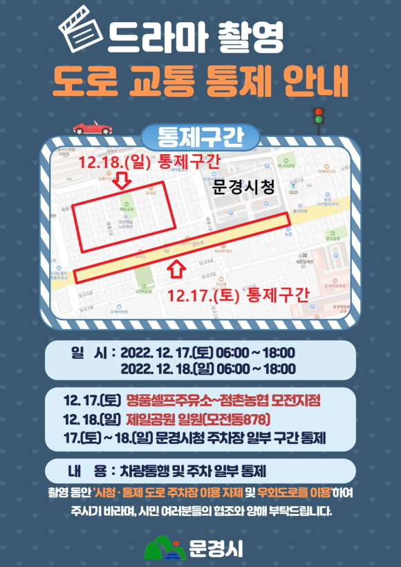 | 문경시는 12월 17일(토), 18일(일) 양일간 오전 6시부터 오후 6시까지 드라마 촬영으로 당교로 일부 구간 및 제일공원(모전동 878)일대 일부 구간이 통제될 예정이라고 밝혔다.