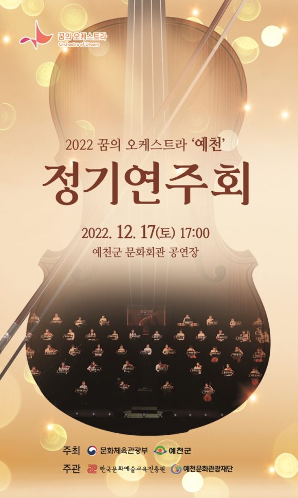 | (재)예천문화관광재단(이사장 김학동)은 오는 17일 오후 5시 예천군 문화회관에서 ‘꿈의 오케스트라, 예천’ 제1회 정기연주회를 개최한다.