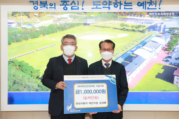 | [문경타임즈] 김재용기자 = (재)예천군민장학회(이사장 김학동)는 현대자동차 예천지점 김재록 영업부장으로부터 장학금 100만 원을 기탁받았다.