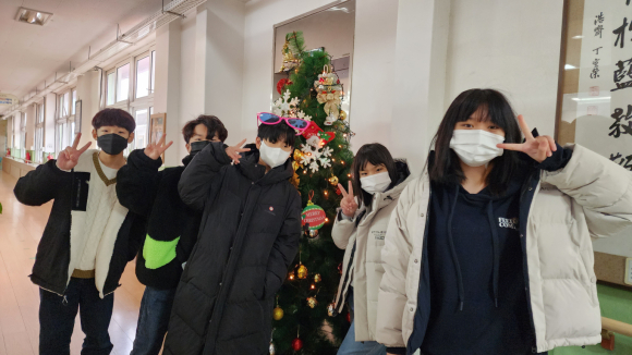 | ↑↑ 학생들은 크리스마스 트리 꾸미기를 마치고 기념사진을 찍고있다. |