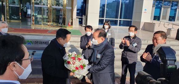 대표단 맞이하는 신현국문경시장, 황재용문경시의회의장