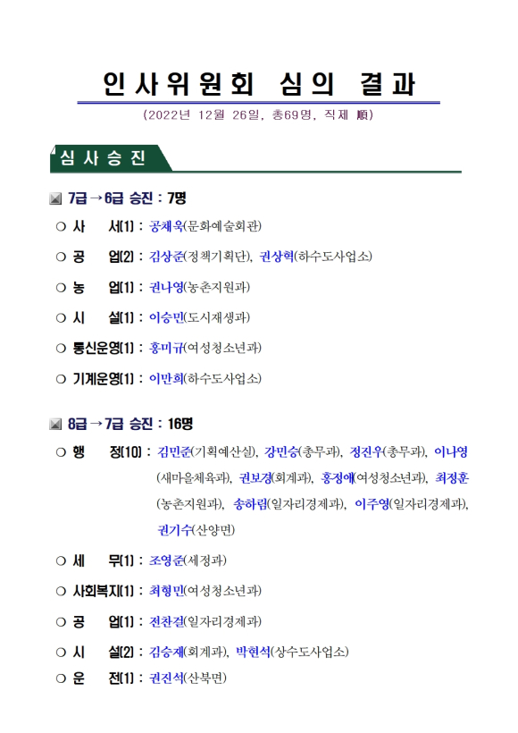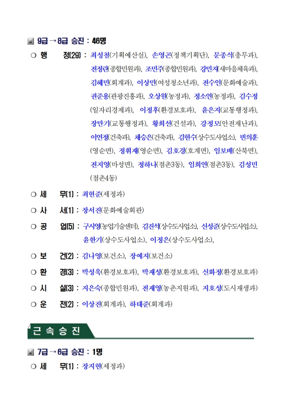 문경시 6급 이하 69명 승진의결