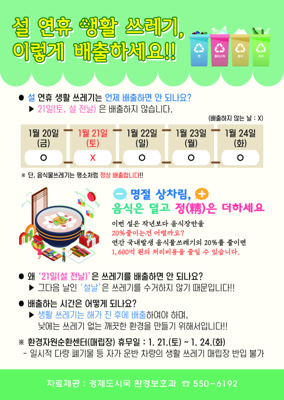 시에서는 생활 쓰레기의 안정적인 처리를 위해 연휴 기간인 1월 21일부터 1월 24일까지 “쓰레기 관리 상황반”과 연휴 기간 동안 발생하는 생활 쓰레기를 신속히 수거하기 위해 “기동청소반”을 편성·운영하며, 읍·면·동에서는 고향을 찾는 귀성객들이 깨끗하고 쾌적한 환경에서 명절을 보낼 수 있도록 연휴 전날까지 취약지역을 중심으로 설맞이 청소를 실시한다.
