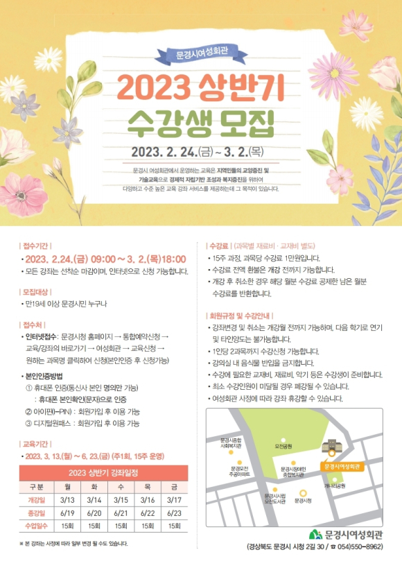 문경시 여성회관은 2월 24일부터 3월 2일까지 선착순으로 2023년 상반기 여성회관 교육생을 모집한다.